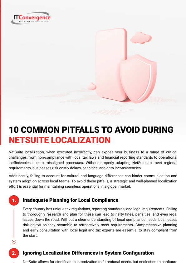 Understanding these pitfalls early on can save your business valuable time and resources. Download this infographic to learn how avoiding these common mistakes can help ensure a smoother, faster, and more cost-effective NetSuite localization.