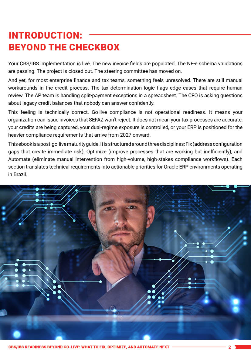 Getting Oracle EBS live with CBS/IBS under deadline pressure almost always means carrying forward gaps: partially configured CNPJ segregation, Split Payment modes that weren’t fully set up, manual reconciliation steps that were never automated, and dual-system reporting that still runs on spreadsheets.