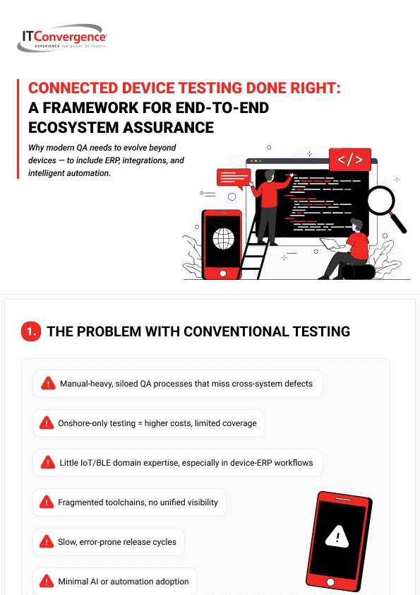 Our infographic, “Connected Device Testing Done Right: A Framework for End-to-End Ecosystem Assurance,” reveals how leading QA teams are redefining testing to ensure every connection — from sensor to ERP, performs flawlessly, securely, and at scale.