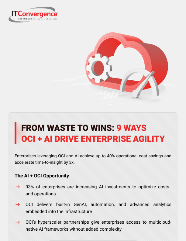 This infographic breaks down 9 real-world, high-impact ways Oracle Cloud Infrastructure (OCI) and AI are helping organizations eliminate waste and accelerate transformation across every layer of the tech stack. From intelligent automation to predictive analytics and secure multicloud optimization, see how OCI is powering a new era of smart, lean, innovation-ready IT.