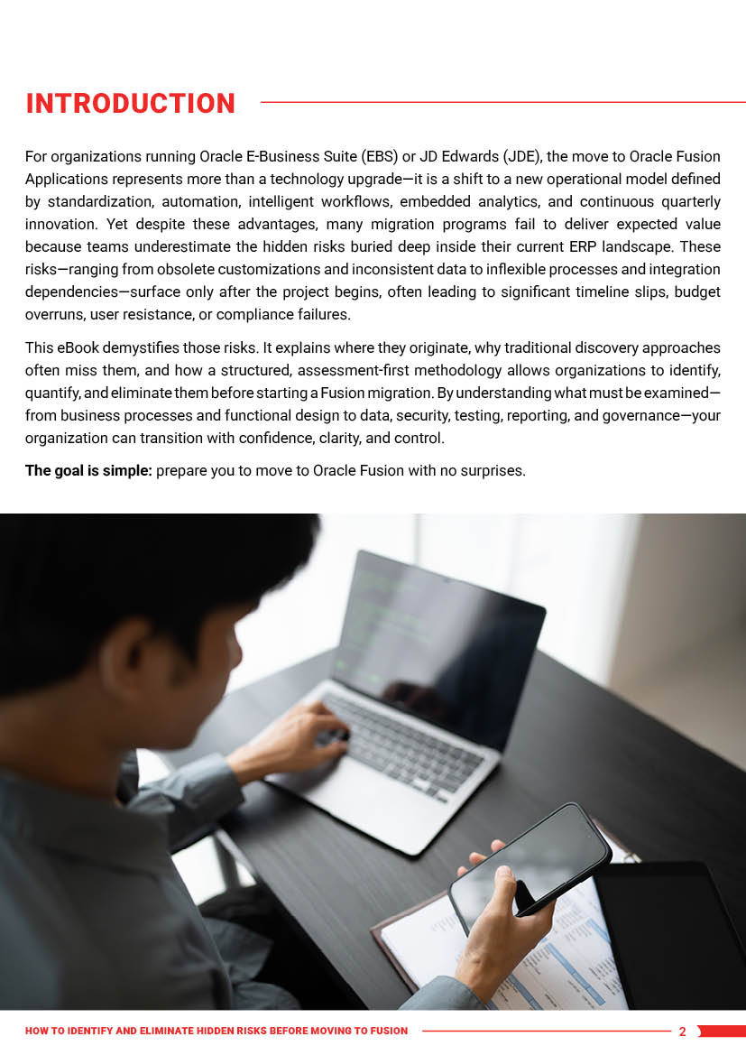 The eBook “How to Identify and Eliminate Hidden Risks Before Moving to Fusion” provides a structured, advisory-led approach to uncover these risks before migration begins. It explains where these risks originate, why traditional discovery methods fall short, and how a comprehensive assessment-first methodology enables organizations to proactively address them.