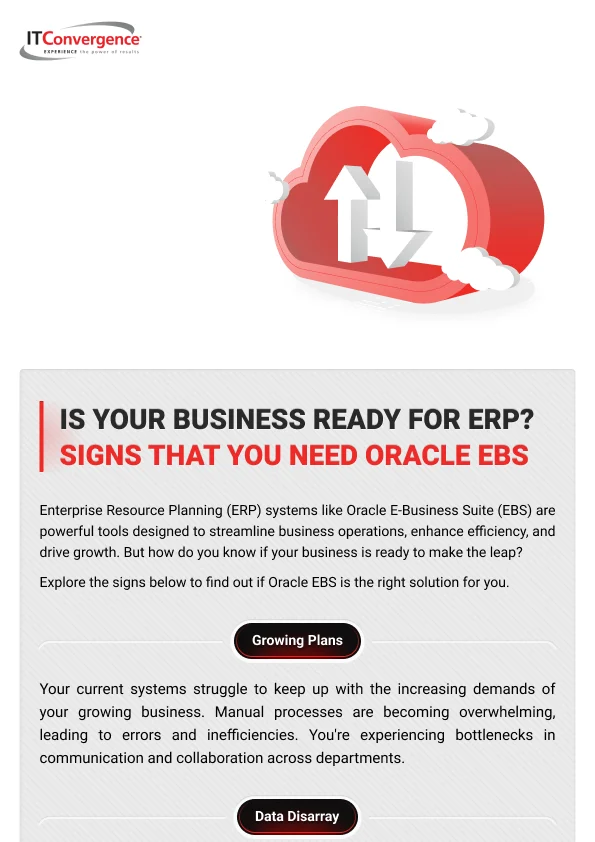 Are you ready to take your business to the next level with Oracle E-Business Suite? Explore our Infographic “Is Your Business Ready for ERP? Signs That You Need Oracle EBS” to learn more about the signs that indicate your business is ready for ERP and how Oracle EBS can transform your operations. Contact us today to schedule a consultation with our team of Oracle EBS experts and embark on your journey toward digital transformation and business success.