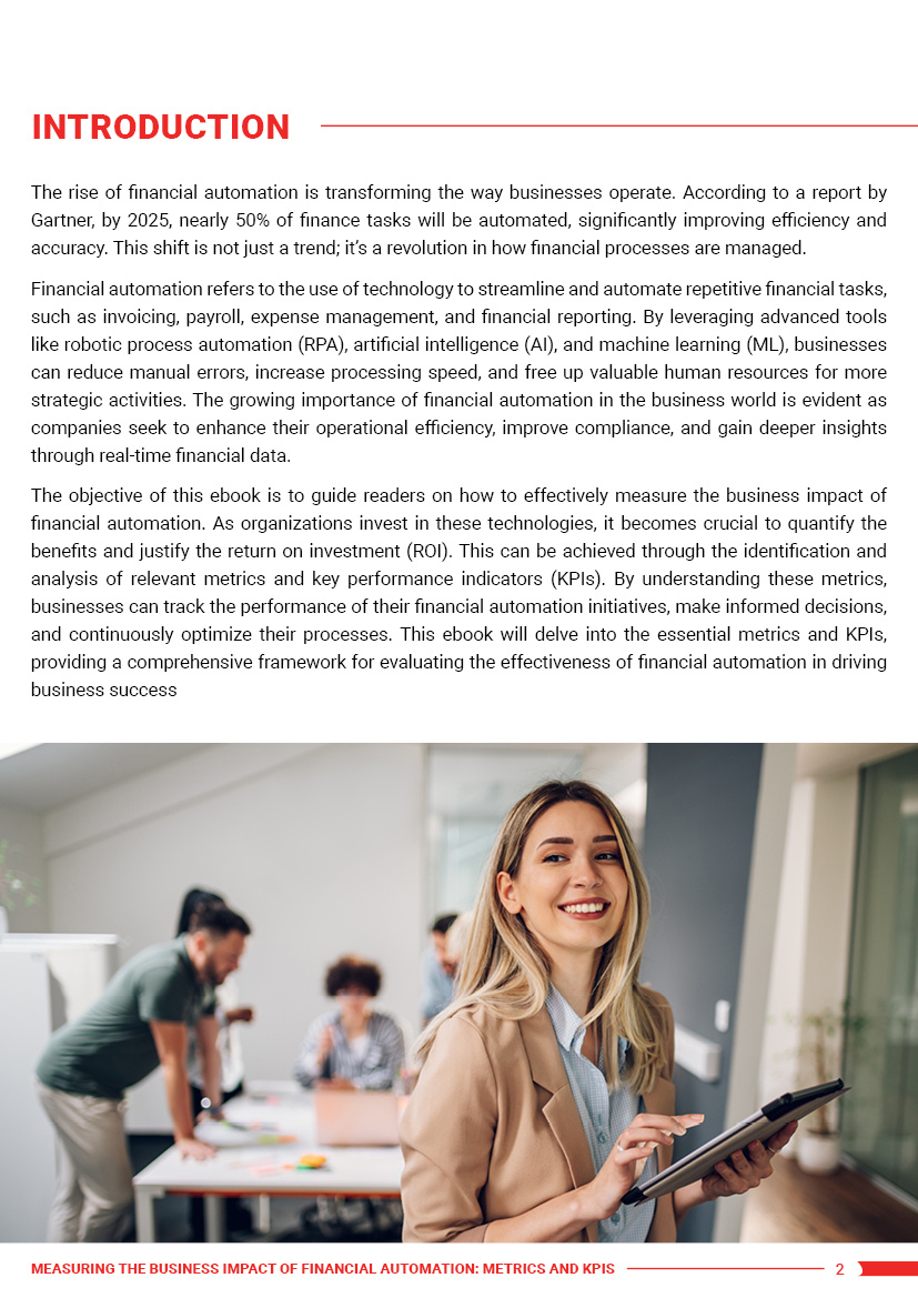 Elevate your business operations and maximize the benefits of financial automation. Download our ebook “Measuring the Business Impact of Financial Automation: Metrics and KPIs” now and start measuring your success with the right metrics and KPIs.