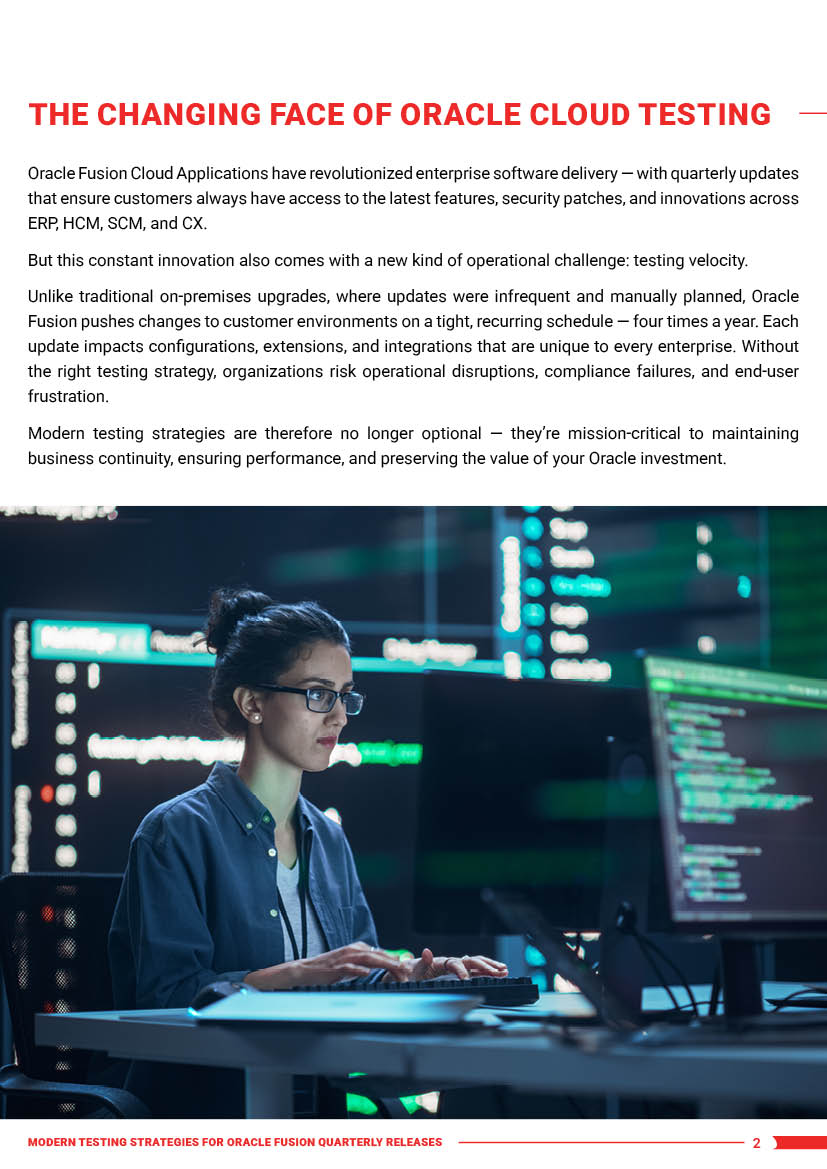 Download our eBook “Modern Testing Strategies for Oracle Fusion Quarterly Releases,” and learn how to modernize your Oracle Cloud testing strategy for continuous compliance, agility, and performance.
