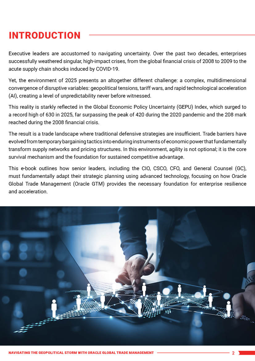 Our ebook, “Navigating the Geopolitical Storm with Oracle Global Trade Management,” explores how enterprises can leverage Oracle GTM to weather uncertainty while driving sustainable growth.