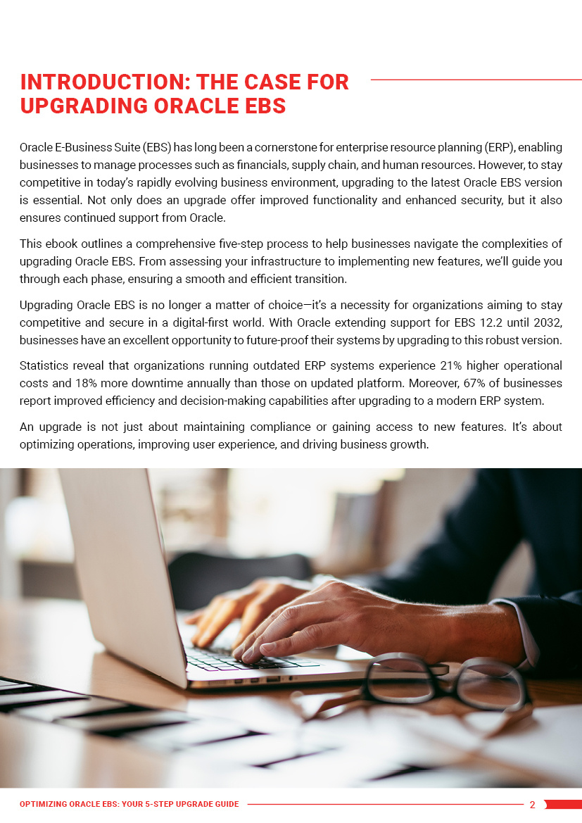 Our ebook, “Optimizing Oracle EBS: Your 5-Step Upgrade Guide,” provides a clear, actionable roadmap to ensure a seamless, efficient, and cost-effective upgrade process.
