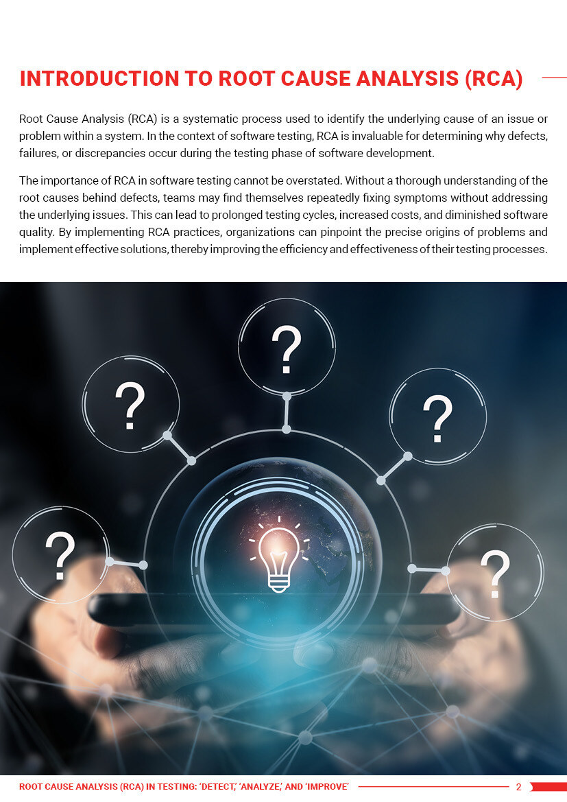 In our ebook “Root Cause Analysis (RCA) in Testing: ‘Detect,’ ‘Analyze,’ and ‘Improve” we’ll explain how to identify anomalies, investigate root causes, and implement effective solutions to streamline your testing processes.