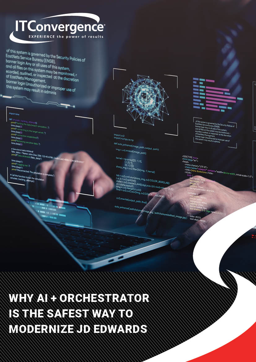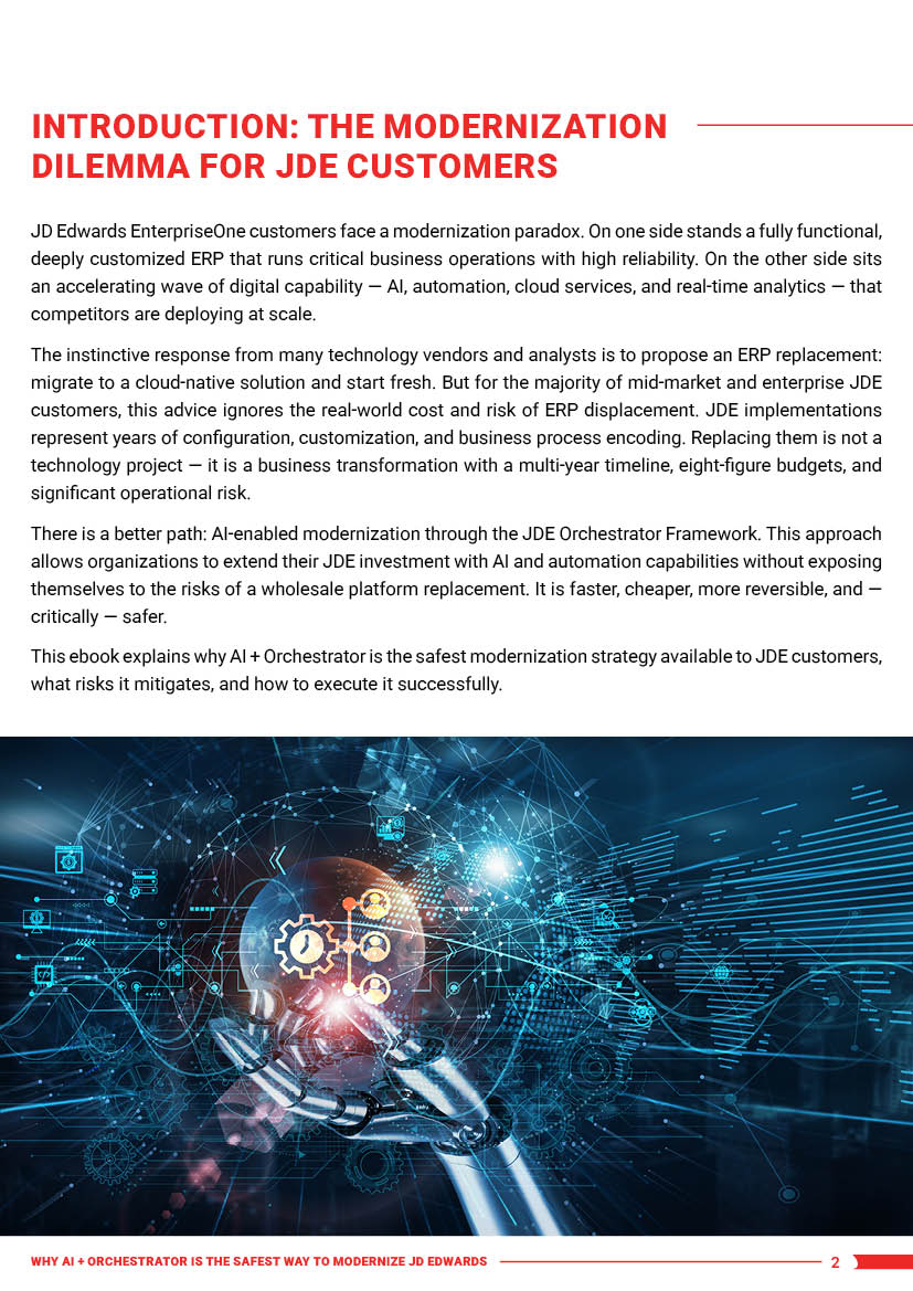 Modernize JD Edwards, without the risk of replacement. Download our ebook “Why AI + Orchestrator Is the Safest Way to Modernize JD Edwards” to learn how to: